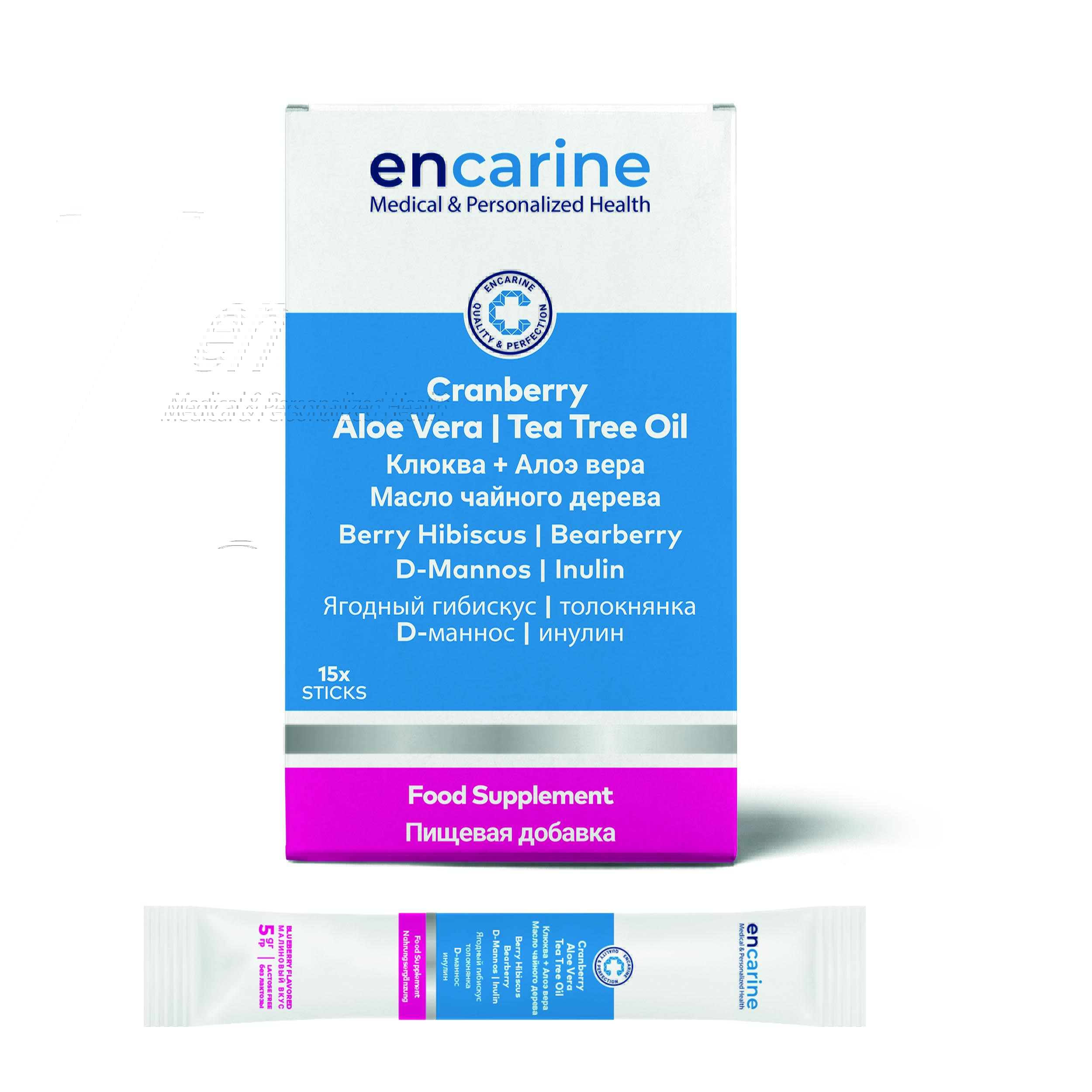 Cranberry, Aloe Vera, Tea Tree Oil, Berry Hibiscus, Bearberry, D-Mannose, Inulin containing nutritional supplement.