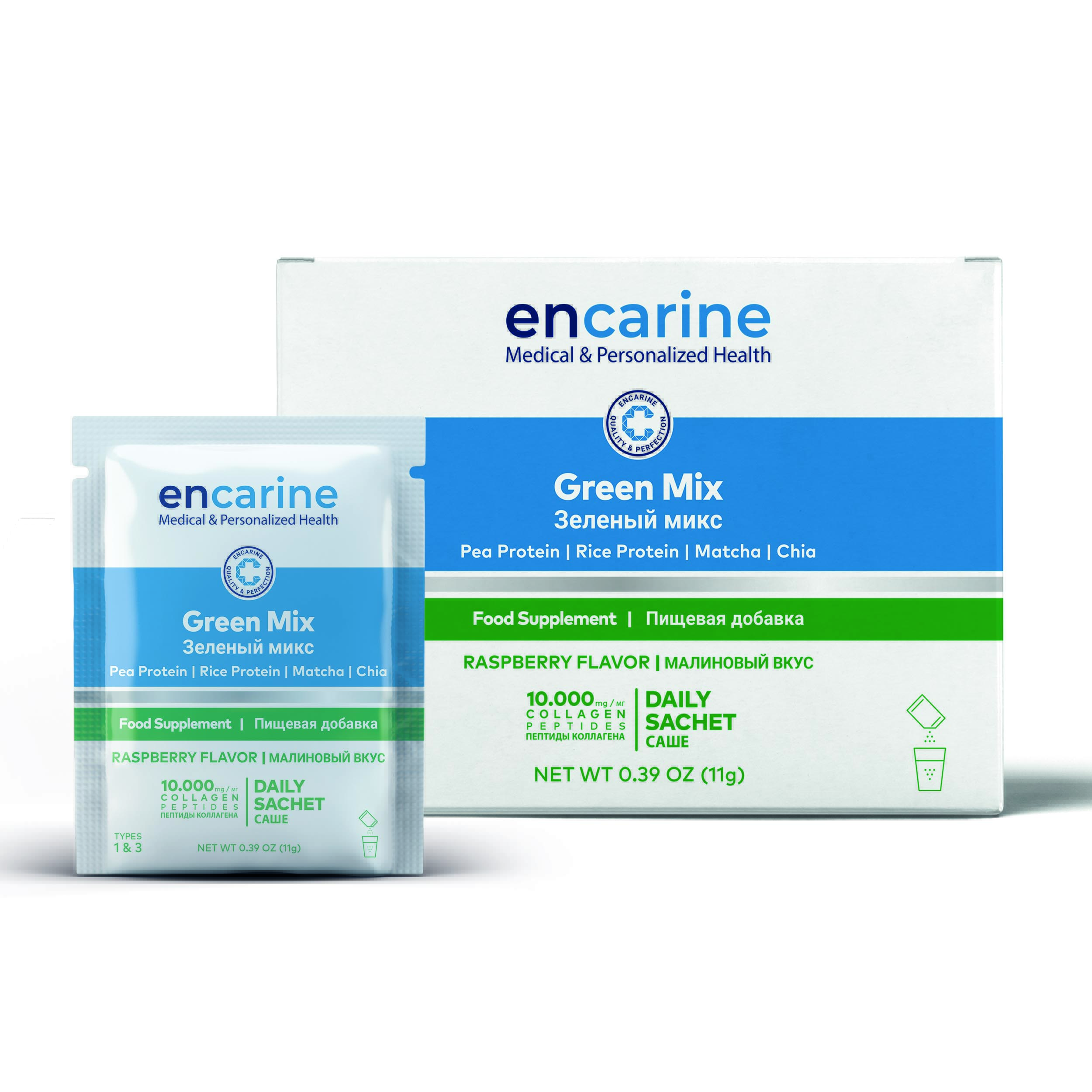 Green Mix, Pea Protein, Rice Protein, Mate, Chia, Matcha, Green Coffee, Goji Berry containing nutritional supplement.